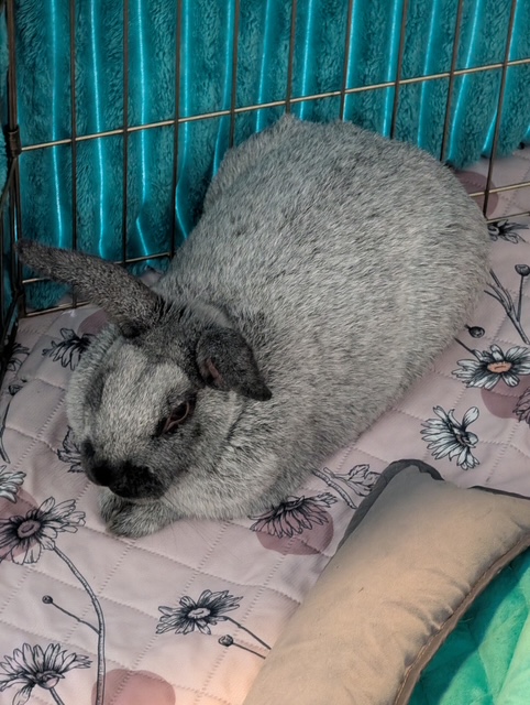 Bonnie is doing well with her litter box training but does require LARGE litter boxes. If they are too small, she hangs her bum out of them while eating her hay. Not her fault she doesn’t fit 🤣 Bonnie had some sores and abscesses on her hocks but those have healed nicely. This girl deserves the best of the best and a family that will allow her to continue to blossom and have the room to do so.